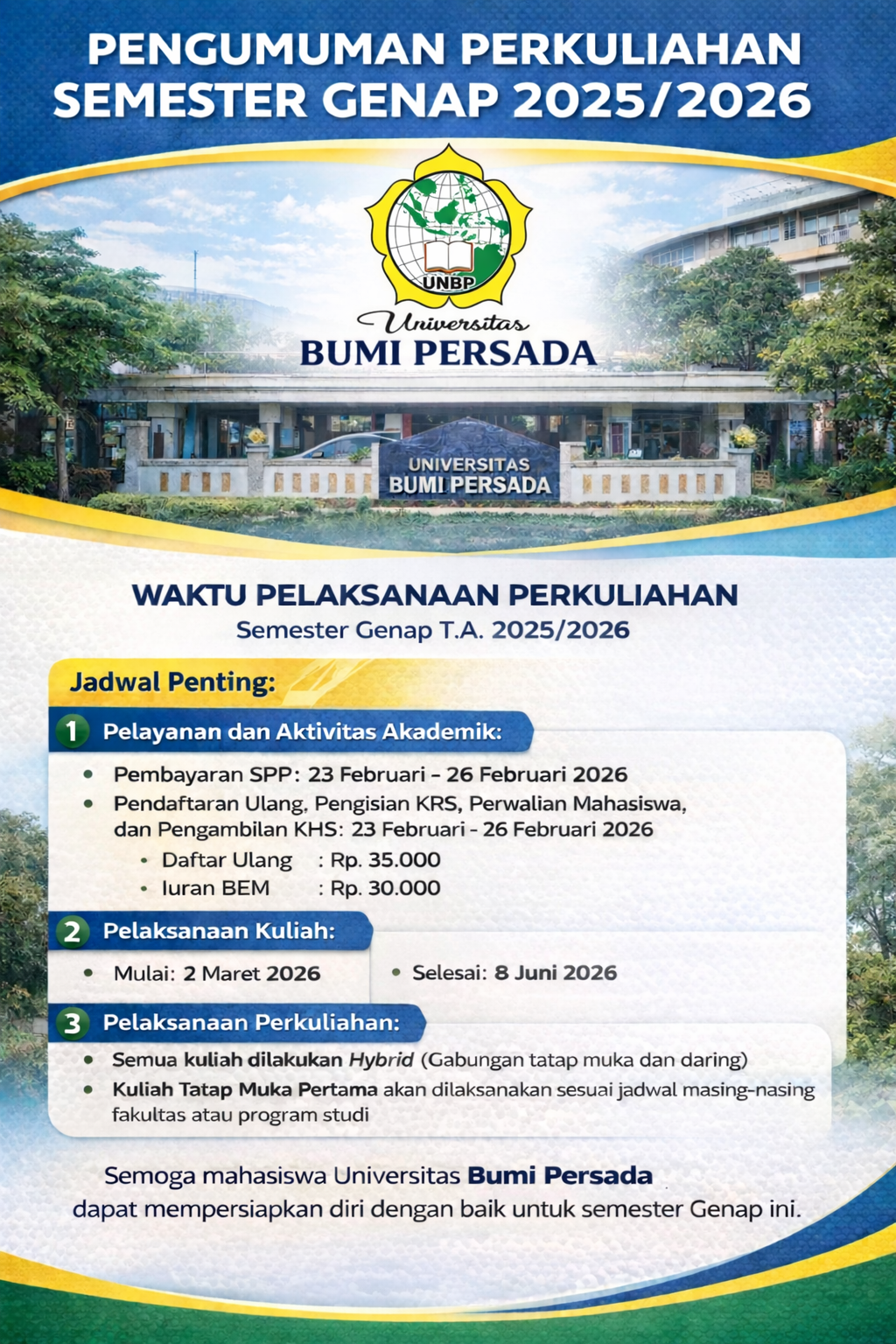 Semester Genap Tahun Akademik 2025/2026 telah tiba! Universitas Bumi Persada mengumumkan jadwal pelaksanaan kegiatan akademik dan kuliah untuk semester ini, yang mencakup berbagai hal penting yang perlu diperhatikan oleh seluruh mahasiswa.