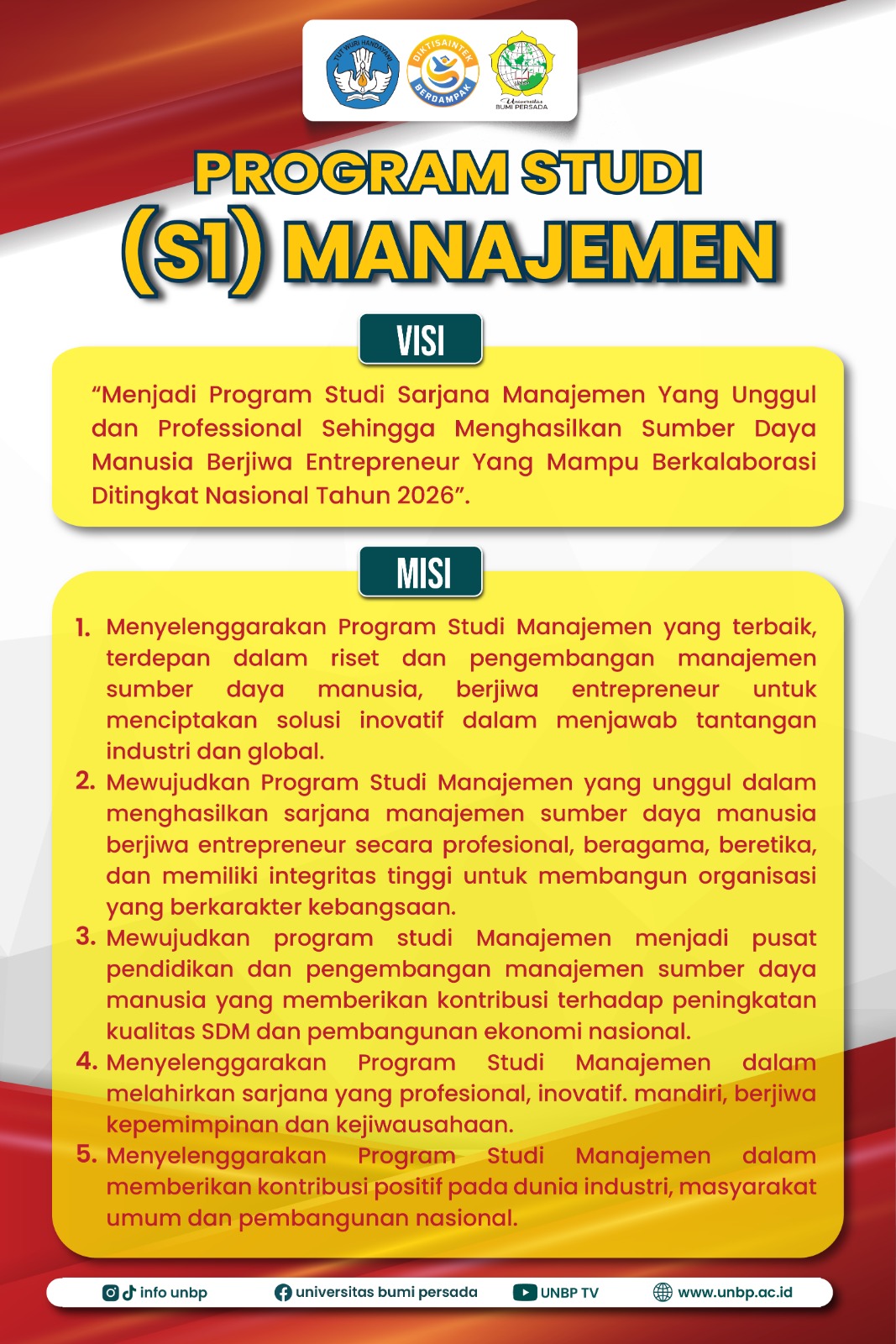 1. Menyelenggarakan Program Studi Manajemen yang terbaik, terdepan dalam riset dan pengembangan manajemen sumber daya manusia, berjiwa entrepreneur untuk menciptakan solusi inovatif dalam menjawab tantangan industri dan global.